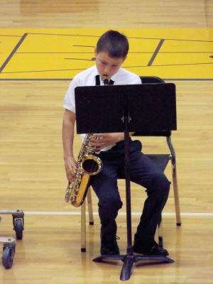 press photos by Linda DeibertWeisenberg Elementary's fifth grade band and chorus students performed for classmates before the end of the school year at an assembly, under the direction of music teacher Carol Fella. Bailen Smargiassi, on alto saxophone, performs “Theme from Symphony No. 9,” by Ludwig van Beethoven.