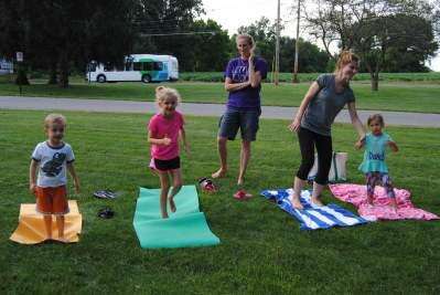PRESS PHOTOS BY SUSAN BRYANTLeo and Ruby Palmieri, and Tara and Genevieve Barrick, all of South Whitehall, try yoga during the family yoga event July 26 on the lawn of Parkland Community Library, South Whitehall. Watching from behind is Emily Palmieri of South Whitehall.