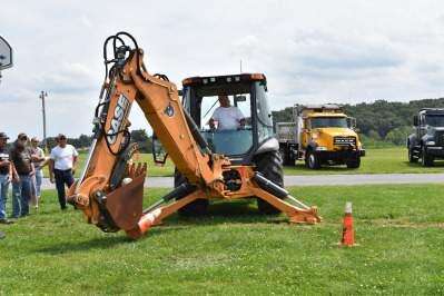 press photo by JULIA fritzRich Bachert III of Upper Macungie won Wheeled Loader Basketball with a time of 41.39 Aug. 11 during the Lehigh County Association of Township Officials summer convention at the Schnecksville Fire Company. Bachert used a wheeled loader to pick up a basketball from the top of a cone and place it in the basketball hoop. Bachert succeeded in placing both basketballs in the