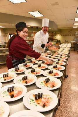 PRESS PHOTOS BY LOU WHEELANDLehigh Career and Technical Institute student Margarita Castro from Parkland High School, works with Chef Shawn Doyle of Savory Grille preparing the first of the five course meal. The LCTI offering was shrimp tempura on salad with poached shrimp and grilled shrimp sushi. Copyright - Lou Wheeland