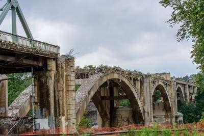 The demolition of the Coplay-Northampton Bridge is underway. Crews began work last week to take down the sides of the pedestrian walkway. Debris could be seen hanging from the span and lying on the ground beneath. The PennDOT project to replace the 1930s structure is expected to take three years.PRESS PHOTOS BY SCOTT M. NAGY Copyright - Scott M. Nagy