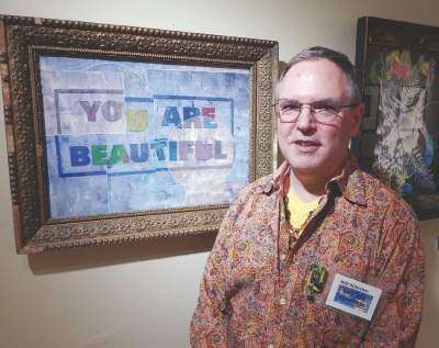 PRESS PHOTO BY ED COURRIEREaston-based artist Will Hübscher with “You Are Beautiful” (monotype-watercolor, 25 in. x 20 in.) in an antique frame. The exhibit, “You Are Beautiful: Monotypes by Will Hübscher,” organized in partnership with the Bradbury-Sullivan LGBT Center, concluded June 9 in the Community Gallery at Penn State Lehigh Valley, Center Valley. Copyright - &Copy; Ed Courrier