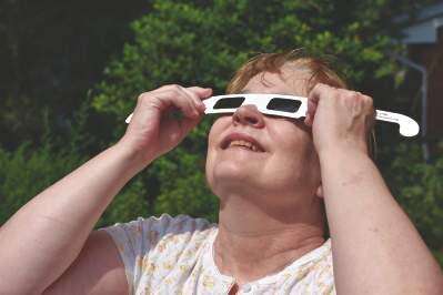 Press photo by ed courrierCathy Courrier, wife of Lehigh Valley Press cartoonist and correspondent Ed Courrier, checks out the progress of the Aug. 21 solar eclipse. The Courriers enjoyed an unobstructed view from their Lower Macungie Township backyard deck with special paper glasses provided by Moran Eye Associates. Copyright - &Copy; Ed Courrier