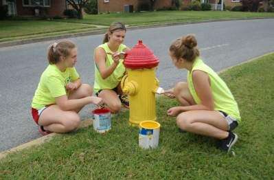 PRESS PHOTO BY AL RECKEREmily Schwartz, Gianna Winkelbauer and Taylor Kerbacher add some color recently to a fire hydrant at Fifth Avenue and Chestnut Street, Stiles. The hydrants are color-coded by water pressure, a project of Northampton Borough Municipal Authority in North Catasauqua, Coplay and Whitehall. Now that the painting is completed for the summer, Emily and Taylor have returned to