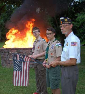 PRESS PHOTO BY AL RECKERBoy Scout Troop 79 members Joe Kiss and Zach Schultz, along with Lehigh County American Legion Commander Gordon Giannotti, participate in a Flag Day program June 16 at Jones-Quigg American Legion Post 739, Hokendauqua. The annual countywide ceremony retires hundreds of worn American flags.