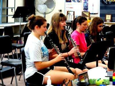 PRESS PHOTOS BY LINDA DEIBERTNWL band students met daily for the last few weeks to learn their field and stand music for the football games during sectional rehearsals. Sharon VanOmmeren, Sara Baran, Elaina Wilson and Morgan Werley practice the music for the first football game.