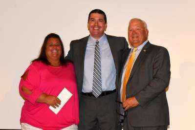 Nitschmann MS teacher Theodora Loupos-Augustino is one of three teachers to receive a BEST (Bethlehem Educational Scholastic Trust) award at the Bethlehem Area school District's 2017 convocation. Loupos-Augustino, a reading and language arts teacher, received the Bernie Cohen Award for excellence in teaching at the middle school level and poses with Nitschmann Principal Peter Mayes and Lehigh