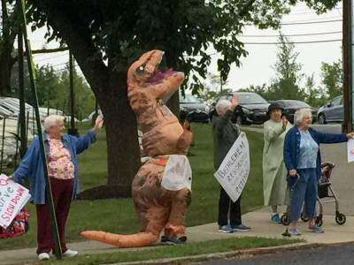 Passing motorists couldn’t help but notice the T-Rex accompanying Lutheran Manor residents last week as they continue their safety walk at the intersection of Westgate and Bathgate drives where they have asked for a lighted crosswalk and a lower speed limit.