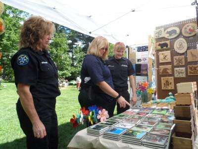 press photos by aaron bergerDiane Williams, EMT for Northern Valley EMS, Michelle Bisbing, pre-hospital registered nurse for NOVA, and Ashley Dymond, PHRN student with Lehigh Valley Health Network Emergency Medical Institute, look at crafts made by Embroidery by Carol of Germansville during their break from the health fair at the Upper Lehigh Lions Club Crafts in the Grove July 29 at Union United
