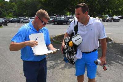 Downtown Bethlehem Association manager Tim Brooks checks in golfer Jim Miller's equipment at the Walla Gazoo. Miller is vice president of perioperative services at the Lehigh Valley Health Network.