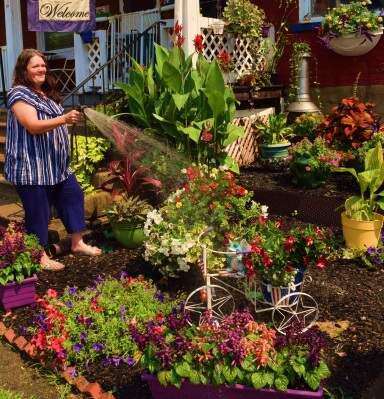 Press Photo by Tim GilmanRobin Hemmerly waters her flower garden in northeast Bethlehem. “I love my flowers and do them every year,” Hemmerly said. “This is my sanity and joy; it keeps me busy,” added the 641 Washington Avenue resident who lives with her husband Bob. “I do all the floral arrangements and water them almost every day,”she said. Robin is a former New York City resident who came to