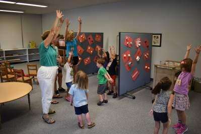 press photos by julia fritzStaff Nancy Steltz and other helpers incorporate fun activities and poem into learning about God with preschool children Addyson Schuler, Avah Ream, Cayden Meitzler, Sawyer Martz-Shelton, Levi Snyder, Alex Heckman and Callie Boscia during Jordan Lutheran Church's Vacation Bible School July 17, in Orefield.