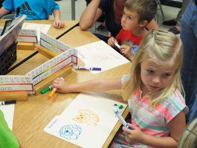A new beginning Kaylynn Knauss decorates her folder for her school work during kindergarten orientation to meet teachers and visit the different rooms Aug. 23 at Northwestern Elementary School.PRESS PHOTO BY LINDA DEIBERT