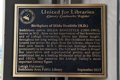 The Bethlehem Area Public Library and Lehigh University have partnered to bring recognition to the poet Hilda Doolittle, who was born in Bethlehem in 1886 at the site of the city’s government complex. Added to the list of national Literary Landmarks, a plaque was recently dedicated at the entrance to the main branch of the library on West Church Street.