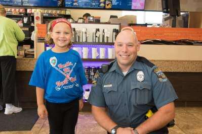 PRESS PHOTO BY LOU WHEELANDUpper Macungie police met township residents Sept. 9 for Coffee with a Cop at the new Dunkin' Donuts, Tilghman Street near Blue Barn Road, Upper Macungie Township. The goal of the event is to encourage residents to know their local police. Gabby Stewart, 6, spends some time with Patrol Officer Bill Rohrbach. Copyright - Lou Wheeland Photography