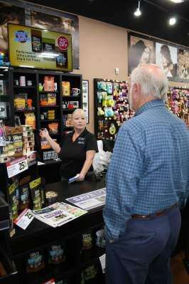 Manager Kathy Cannon describes some of the health supplement options for resident Bob Hero's cats. “You have to build relationships here,” she said. “This is a place where somebody has to come back every week. [Eventually] you walk down the street and people wave to you.”