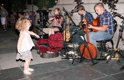 PRESS PHOTOS BY DENNIS GLEWPoor Man's Gambit, which consists of Genevieve Gillespie on violin, Cary Pursell on accordion and Dylan Richardson on guitar, played one rousing number after another on Main Street. Aria Verchot, swept up in the mood, dances along.