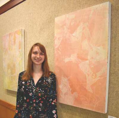 PRESS PHOTOS BY ED COURRIER“The Moravian College Alumni Show: Emily Strong and Abbey Rosko, Class of 2015,” continues through Oct. 23, H. Paty Eiffe Gallery, Haupert Union Building, Moravian College, Bethlehem. Above left: Abbey Rosko with her work, “Stair (right)” (2017, oil on canvas). Above right: Emily Strong with her work, “Emergence” (2017, oil on canvas). Rosko and Strong share a studio at Copyright - &Copy; Ed Courrier