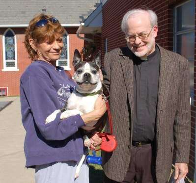 PRESS PHOTOS BY AL RECKERThe Rev. Tim Boyer, pastor of St. John's Lutheran Church in Coplay, blesses 8-year-old Ricky, held by Machelle Ivankovits, of Coplay, during the church's annual blessing of the animals service Sept. 30.