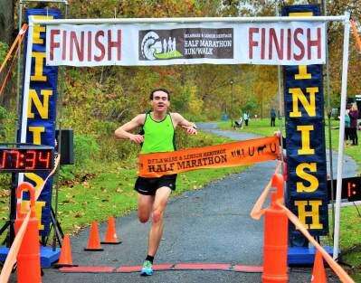 PRESS PHOTOS BY TINAMARIE MARTINRight: Jeff Young, of Bryn Mawr, is the first male to cross the finish line at Canal Street Park, Northampton, during the D&L Heritage Half Marathon run and walk, held Nov. 5. The race began at Northern Lehigh High School, Slatington, and ended in the borough. More than 900 runners/walkers participated.