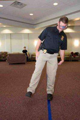 PRESS PHOTOS BY LOU WHEELANDEven police officers find it difficult to “Walk the Line” using DUI simulation goggles to replicate the effects of alcohol on vision. South Whitehall Police Sgt. George Hummel is the volunteer “walker.” Copyright - Lou Wheeland Photography