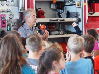 PRESS PHOTOS BY LINDA DEIBERTWeisenberg third-grade students visited Weisenberg Volunteer Fire Station 51 Oct. 20 to learn about fire safety and explore the engines. Weisenberg Deputy Chief Bill Wolford talks to students from Angie Rimm's class about one of the fire trucks.