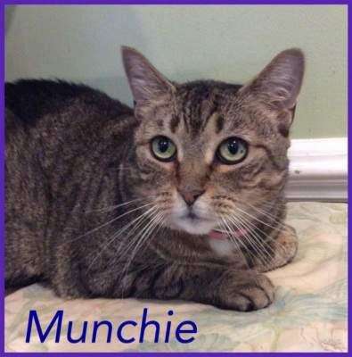 Munchie was one of three cats living in a store. Munchie has been very overwhelmed at the shelter but is starting to trust volunteers. She will surely thrive in a loving home with patient and understanding people. Munchie is about 2 years old, healthy, spayed, vaccinated and negative for feline leukemia.