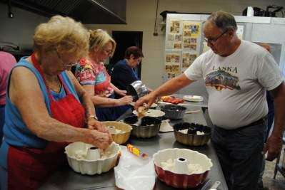 PRESS PHOTO BY SUSAN BRYANTMarie Dean places dough for sticky buns into a ring cake pan as Pam Kohler pours syrup over the dough. Dave Schafer sprinkles dry pudding mix into a pan. In the back, Suzanne Pfeiffer places dough into a ring cake pan to make pull apart sticky buns for the NOVA Ladies Auxiliary sticky bun sale this spring at their headquarters.