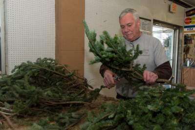 PRESS PHOTOS BY LOU WHEELANDLehigh Valley Home and Garden Center, South Whitehall, was ready for Christmas. With evergreens in hand, the staff constructed wreaths, grave blankets and beautiful decorations. Owner Tom Dreyer works on evergreen branches preparing them for a variety of holiday decorations. Copyright - Lou Wheeland Photography