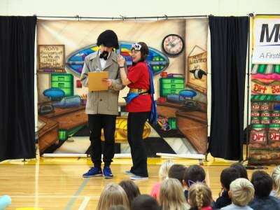 PRESS PHOTOS BY LINDA DEIBERTCory Clark as Fred and Kristen Arbutina as Nikki Neutron, of the National Theater for Children, recently taught Weisenberg Elementary students the importance of energy in the Energized Guyz program. Clark played Sneaker, Thunderstorm and others who waste energy.