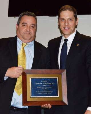 Board President Marty Nothstein, right, presents a plaque in recognition of service to outgoing Commissioner Thomas C. Creighton III, who was sworn in as the Lehigh County commissioner representing District 1 in January 2010.