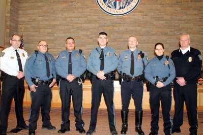 press photos by bernie O'HareFlanked by Chief Dan Pancoast and Capt. Greg Gottschall, the officers honored are Grimaldi Gonzalez, Robert Stametz, John Meehan, Sgt. Daryl LaPointe and Gretchen Kramer.