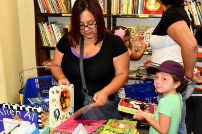 PRESS PHOTO BY DANA GRUBBVanessa Good and her six-year-old daughter Elena shop for children's books at the September book sale. Elena's favorite topics are cats and other animals. They reside in Easton and visit the sales regularly.