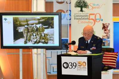 press photos by dana grubbWorld War II veteran, Major Nathan Kline, recounted his experiences flying on 65 missions in a B-26 Marauder as a bombardier and navigator. “This was total war,” said Kline, who served in the US Air Force for forty-two years and is currently the military liaison to the City of Allentown.