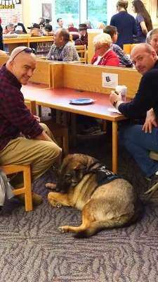 PRESS PHOTOS BY LINDA DEIBERTWeisenberg Elementary School treated veterans in the community to breakfast Nov. 10, 2017, in the school library. After breakfast, the veterans lined up in the hallway and greeted students as they entered school. Tom Can and his Guardian Angel service dog Corporal Camo enjoy breakfast with John Adams.