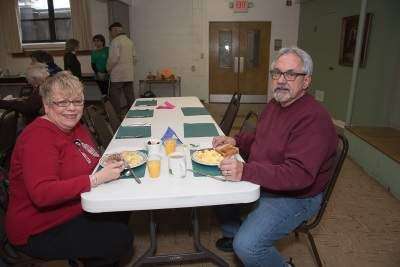 Donna and Gene Lahouchuc, of Greenawalds, South Whitehall, enjoy their breakfast at the Greenawalds UCC fundraiser. Copyright - Lou Wheeland