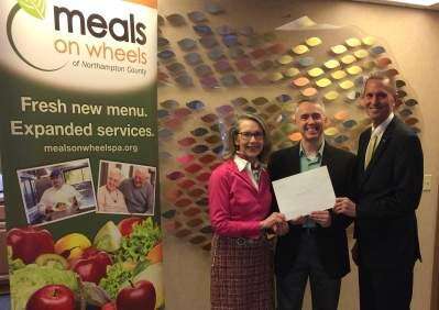 Tom Harper (center), director of development for Meals On Wheels of Northampton County, accepts a $20,000 grant award from R.K. Laros Foundation Executive Director Sharon Jones Zondag and Laros Trustee Ron Donchez. Meals On Wheels of Northampton County will use the R.K. Laros Foundation's generous grant award to expand its Bethlehem-based kitchen and overall facility.