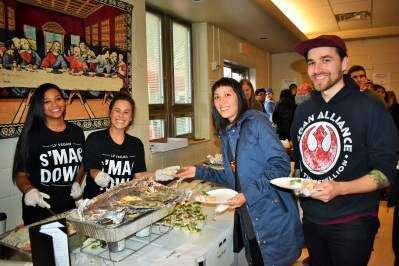 PRESS PHOTO BY TINAMARIE MARTINLuisa Morla and Brianna Siedt, with Grain, serve Gayhong Hua and Matt Gertz, of New Jersey, a sample of their vegan macaroni and cheese at the first-ever Lehigh Valley Vegan sMAC DOWN, held Nov. 18, 2017, at Faith Evangelical Lutheran Church, Hokendauqua.