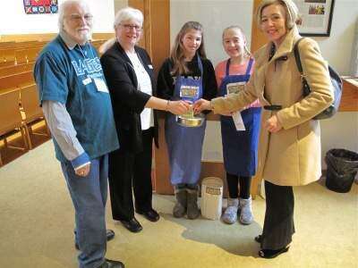 PRESS PHOTOS BY DON WENNERThe Lutheran Church of the Holy Spirit, 3461 S. Cedar Crest Blvd., Emmaus, was just one of many Lehigh Valley churches who participated in the Souper Bowl of Caring Feb. 4. Youth of the church greeted parishioners at the end of each service holding soup pots to collect money for worthy charities. ABOVE: Caitlin McCormick and Kate Nesfeder accept donations from Pete and