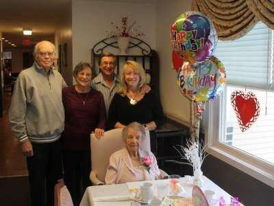 PRESS PHOTO BY PAUL CMILPauline (Pidstawski) Takacs celebrates her 100th birthday with family - her daughter Nancy Husak and her husband, Ihor (left), and her son Charles Takacs and his wife, Joan - Feb. 6 at Renaissance Assisted Living, Northampton.