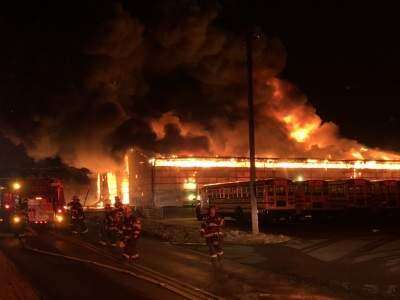 PRESS PHOTO BY BILL ROHRERFlames destroyed the Parkland School District bus garage and some 30 school buses during the early morning hours of Feb. 23. Classes were canceled for the day and students returned Monday morning. Story and additional photos on pages A7, A8.