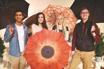 Catasauqua High School “Singin' in the Rain” cast includes, from left, Connor McCully (Don Lockwood), Noel Cruz (Kathy Selden), Zoe Mulzet (Lina Lamont) and Branden Bilheimer (Cosmo Brown). Copyright - &Copy; Ed Courrier