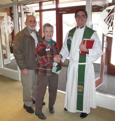 PRESS PHOTOS BY ED COURRIERThe USAF Singing Sergeants' officer in charge, 1st Lt. Phillip Emory, presents Eric G. Gombert, St. John's director of music with an autographed portrait of the ensemble toward the end of the concert. Copyright - &Copy; Ed Courrier