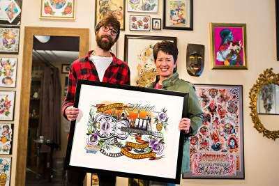 CONTRIBUTED PHOTO BY olaf starorypinskiLansdale, Montgomery County, resident Dan Mugrauer, left, and ArtsQuest President & CEO Kassie Hilgert, right, with 35th anniversary Musikfest artwork. The design will be used as the Musikfest poster, and on the festival mug, merchandise and apparel. Musikfest, with more than 500 performances on 16 stages throughout Bethlehem, is Aug. 3-12.
