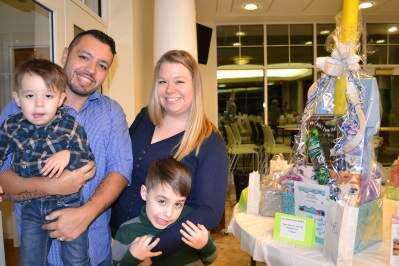 Concordia Lutheran Preschool, within Concordia Lutheran Church, 2623 Brookside Road, Macungie, held its annual spaghetti dinner and silent auction recently. The almost sold-out evening featured great food, enthusiastic volunteers and a huge selection of basket auction prizes. ABOVE: Cristian and Vanessa Gonzalez with Nathan and Sebastian take a moment to check out the gift baskets while waiting