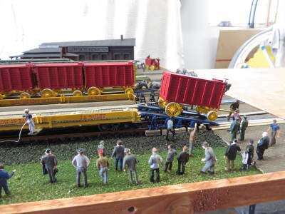 The piggy-back method was accomplished by loading from ramps at the rear of the train and moving the wagons forward instead of lifting them on the train cars. Spanners were placed between the cars like bridges to fill in the gap.