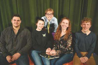 Allentown Central Catholic production of “Disaster!” includes, from left, front, Nick Cerimele (Chad), Riley Loz (Marianne), Sarah Johnson (Jackie), and Michael Fleck (Professor Ted Schneider), and, back, Dylan Brown (Tony DelVecchio). Copyright - &Copy; Ed Courrier
