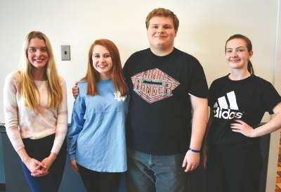 The Notre Dame High School “Cinderella” cast includes, from left, Larsen Lencheski (Marie, Fairy Godmother), Evie Carlin (Cinderella), Greg Bianchi (Topher, Prince), and Harper Hogan (Madame). Copyright - &Copy; Ed Courrier
