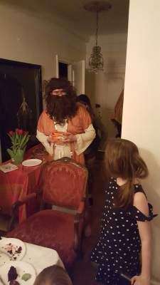 Elijah entered for the cup of wine awaiting him at the table and then handed out candy frogs to the children.