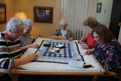 PRESS PHOTOS BY SUSAN BRYANTQuilters from United Church of Christ, Neffs, Janet Creitz of Schnecksville, Ruth Ensley of Lower Macungie, Berta Blose of Allentown, Mary Burdick of Orefield and Sandy DeBode of Schnecksville quilt a baby blanket at The Neffs National Bank.